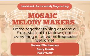 Come together to sing at Mosaic. From Musical to Motown and everything in between. Requests welcome! Please contact angela@choosemosaic.org to register your interest.