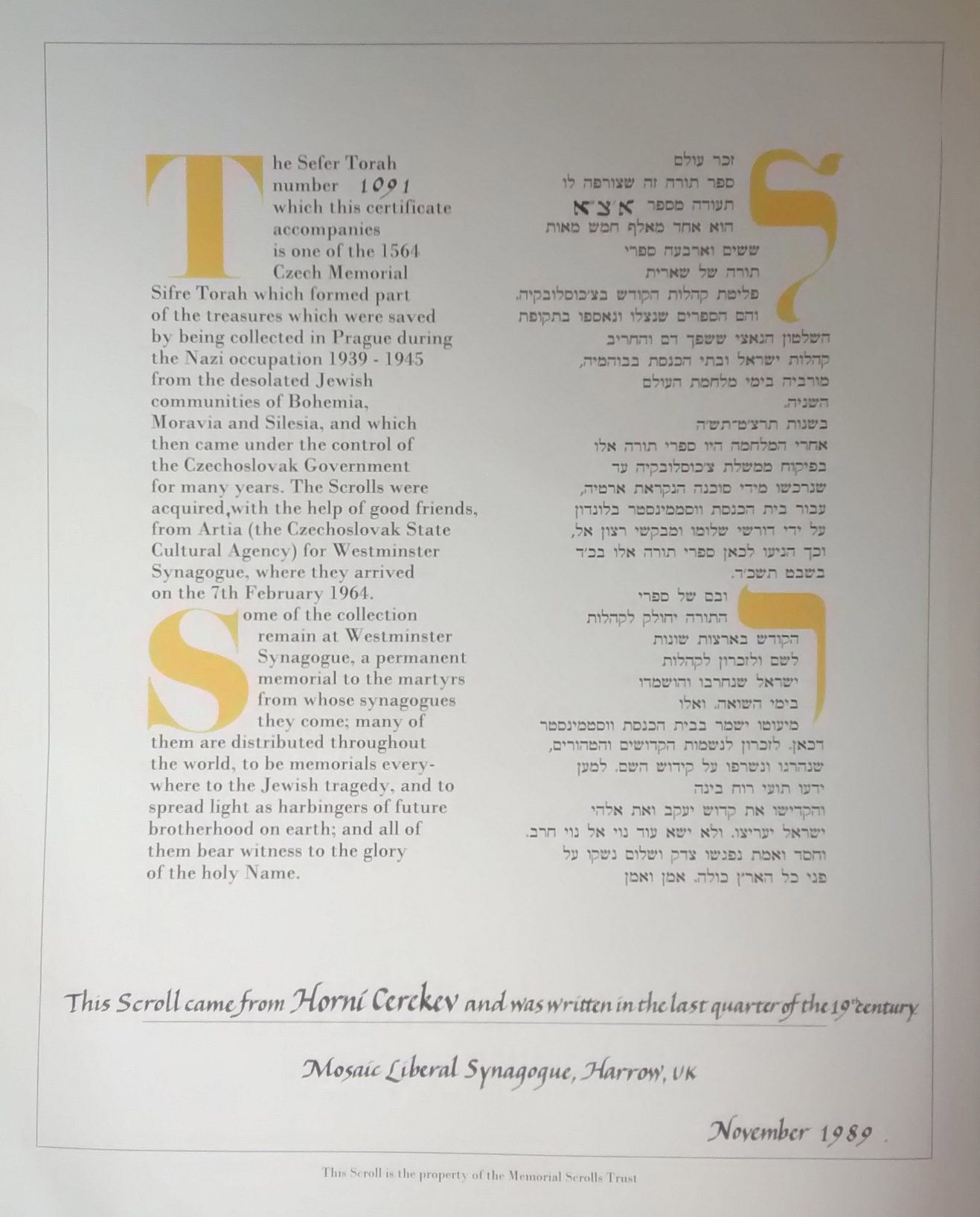 In 1964 Westminster Synagogue managed to purchase the 1,564 Czech Memorial Scrolls from the Czechoslovak Communist State, and became their new custodian. Most Scrolls arrived at Westminster Synagogue with a number label attached, which referred to the original German Card Index that had been prepared by the Jewish curators at Pragueâs Central Jewish Museum. Unfortunately 216 of the Scrolls that came to Westminster Synagogue cannot be traced to any particular community, either because the number label for that Scroll became detached or because the information available is insufficient to relate them to a particular place. They became known as the âorphan Scrollsâ.