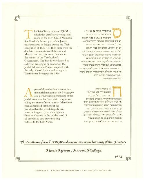 In 1964 Westminster Synagogue managed to purchase the 1,564 Czech Memorial Scrolls from the Czechoslovak Communist State, and became their new custodian. Most Scrolls arrived at Westminster Synagogue with a number label attached, which referred to the original German Card Index that had been prepared by the Jewish curators at Pragueâs Central Jewish Museum. Unfortunately 216 of the Scrolls that came to Westminster Synagogue cannot be traced to any particular community, either because the number label for that Scroll became detached or because the information available is insufficient to relate them to a particular place. They became known as the âorphan Scrollsâ.