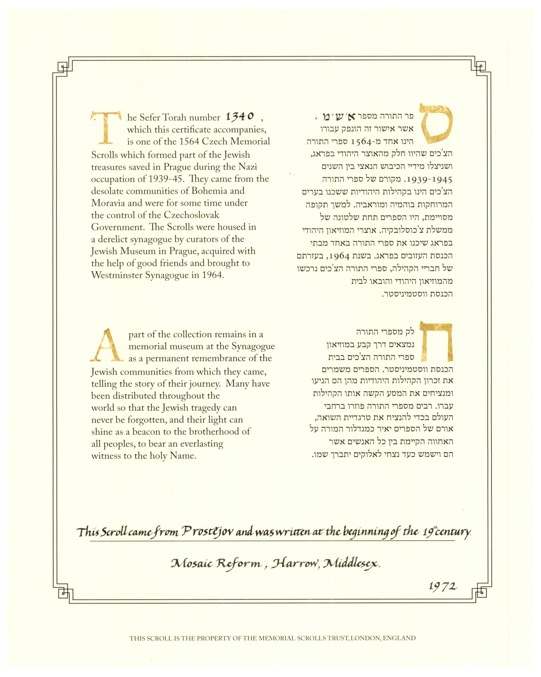 The original catalogue number, 1340, which is still visible on the wood of the left Eitz Chayyim (pole), links Mosaic Reformâs Scroll to Prostejov, a rather picturesque town in Moravia’s Hana region near the town of Olomouc (about 30 miles north-east of Brno, the capital of Moravia), on a key trade route connecting Europeâs south with Europeâs north, which made it an important centre of culture, trade, and industry.